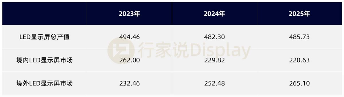 《2025全球LED显示白皮书》显示,2025年LED显示屏整体产值约486亿,境内LED显示屏市场规模约为220.63亿;境外LED显示屏市场规模约为265.10亿,同比2024年约有5%的增长。